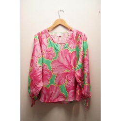 Deze blouse heeft knoopje op de rug een normale pasvorm, ronde hals en borduurwerk op de borst en bij de polsen.